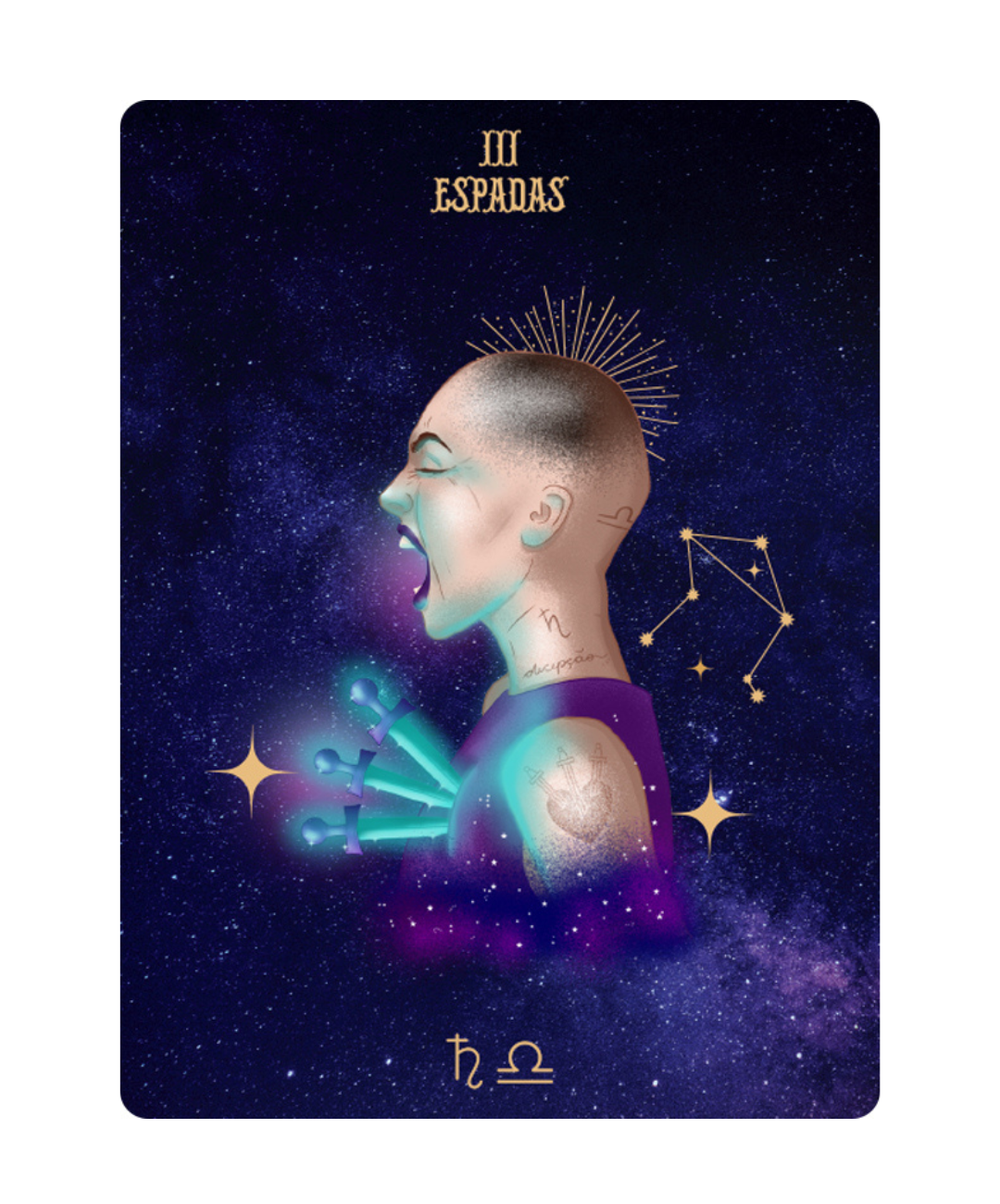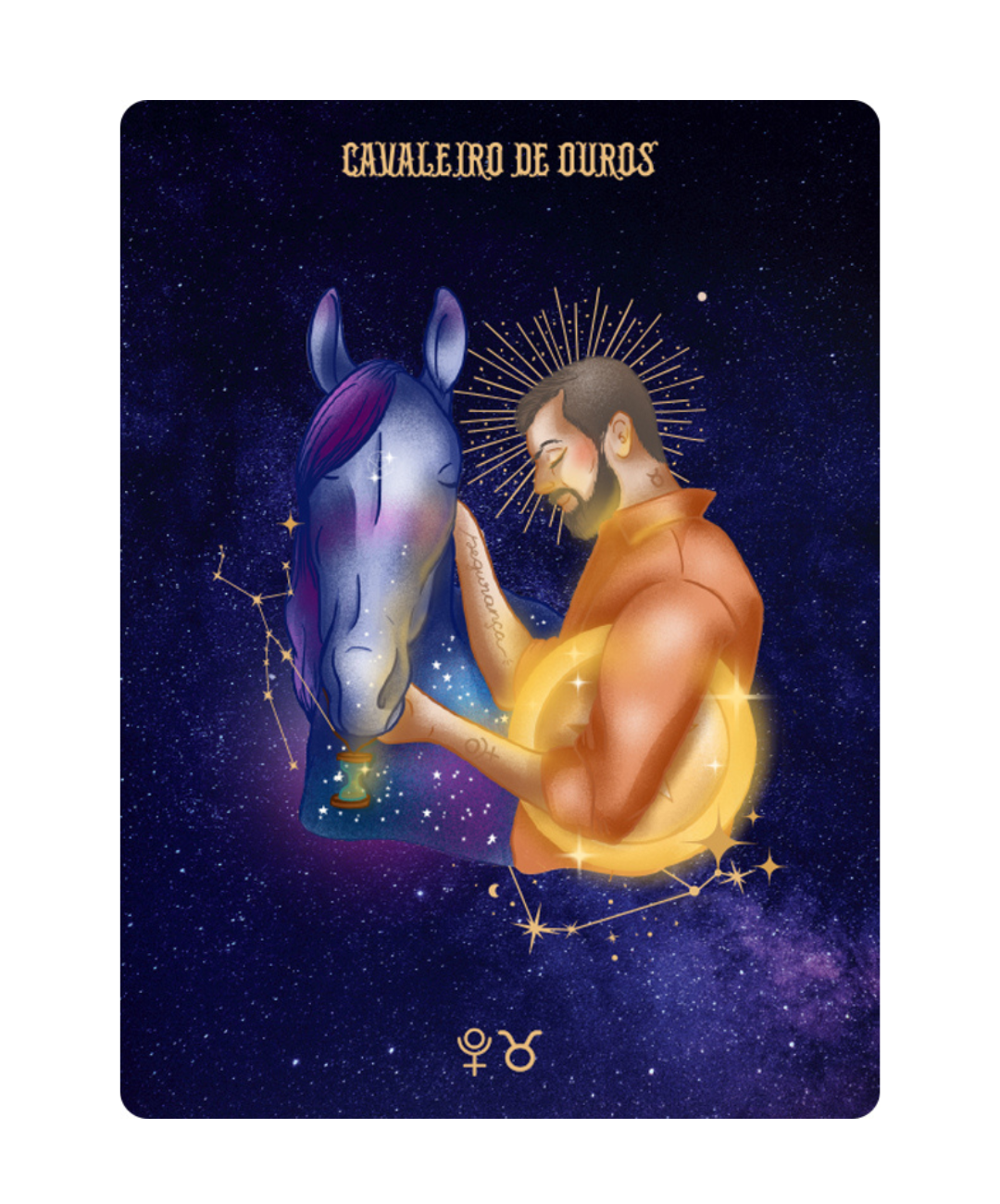 Um baralho exclusivo composto por 78 cartas tradicionais + 6 cartas extras de nodos lunares e elementos da natureza, que unem os arquétipos do tarot com símbolos astrológicos e personagens contemporâneos.